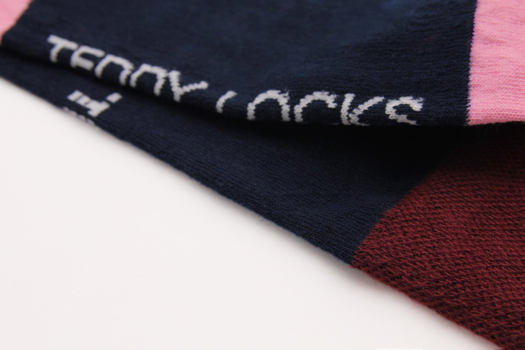 Close-up of our navy, pink and burgundy crew sock with Teddy Locks branding.