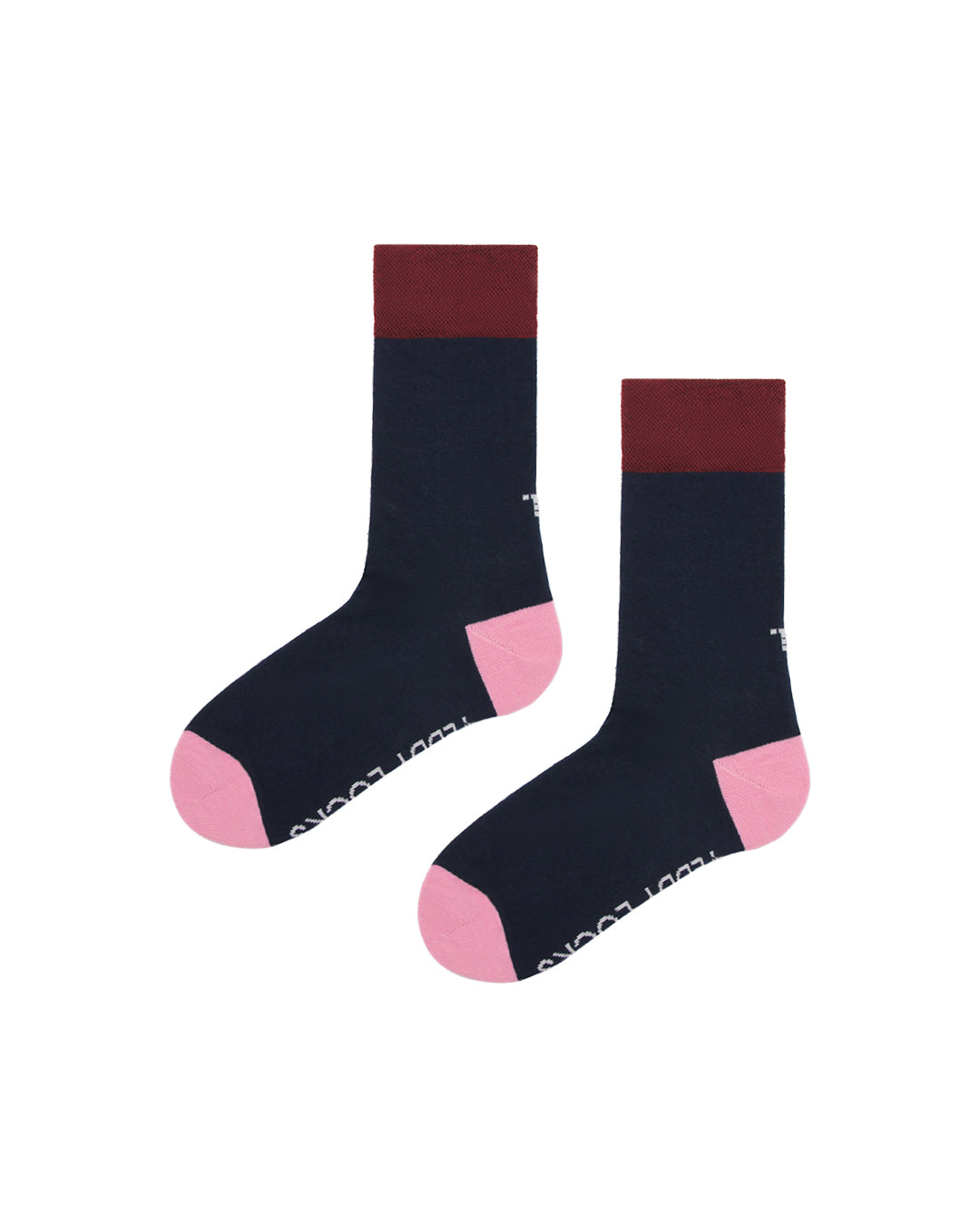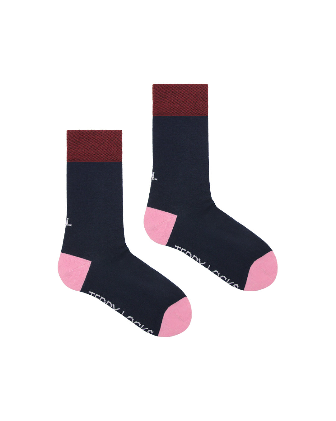Teddy Locks navy crew socks with pink toe and heel and a burgundy welt.