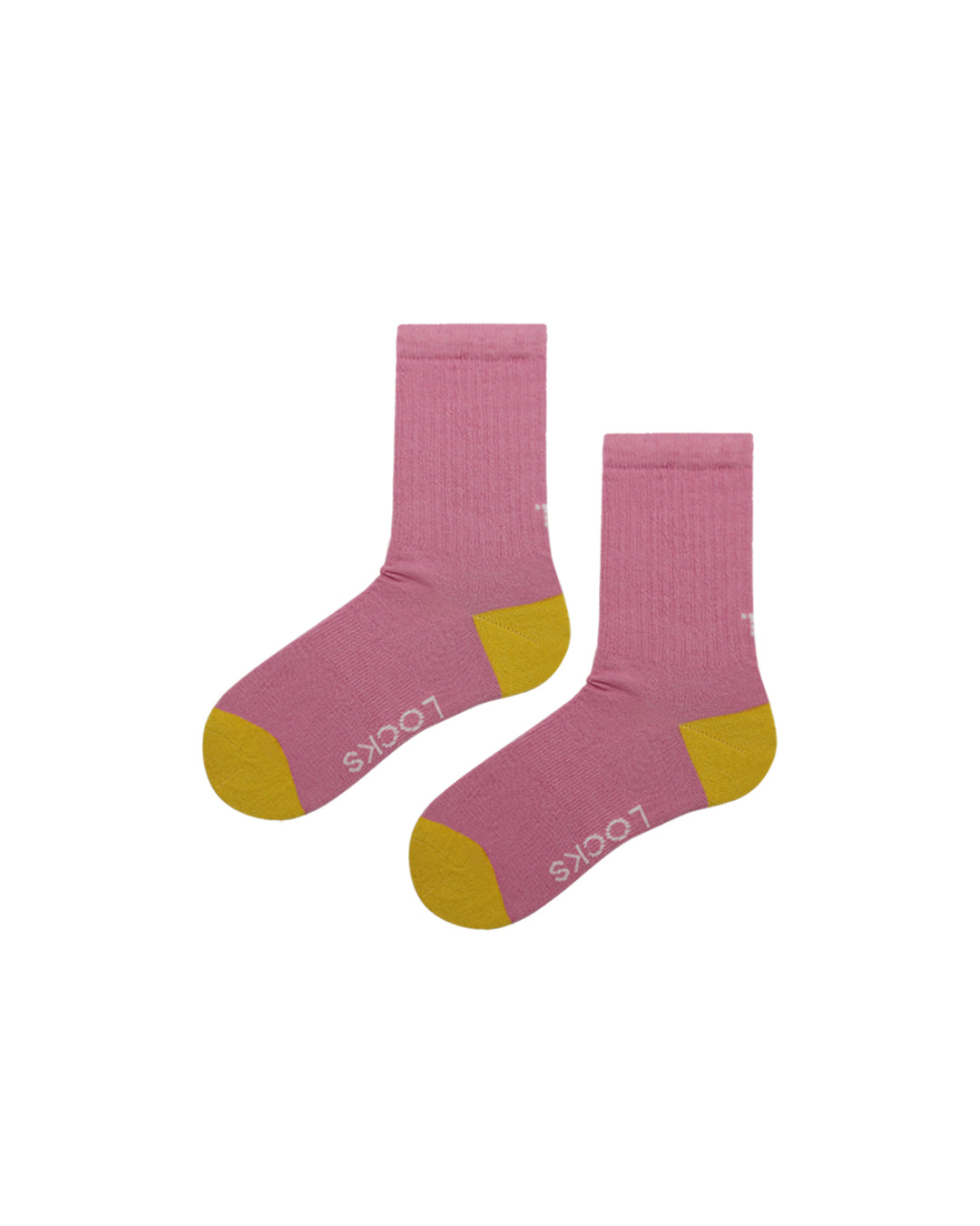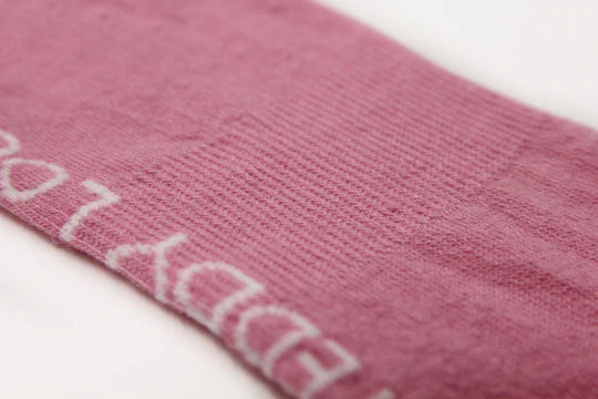 Close-up of arch support elastic in pink and yellow ribbed crew socks