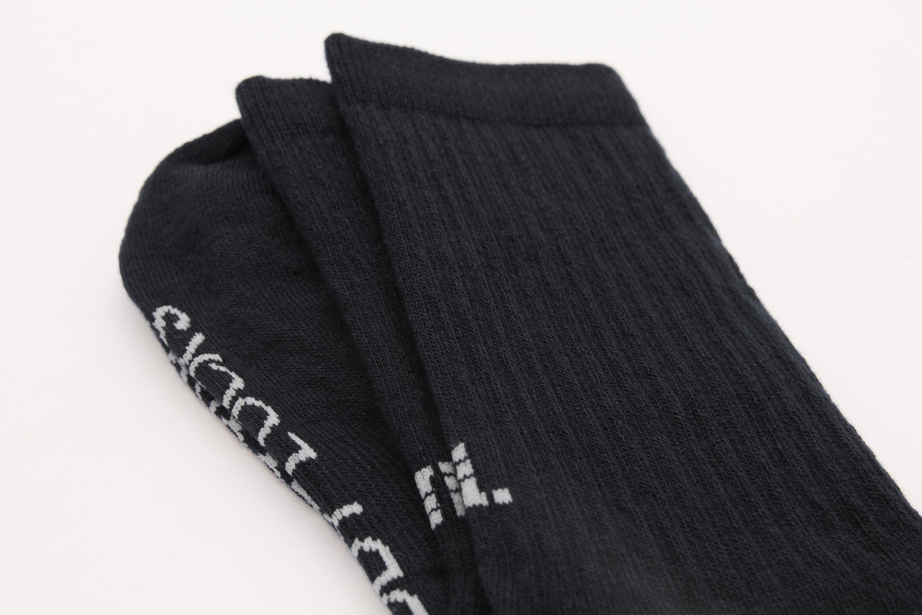 Close-up of black ribbed crew socks and the ribbed leg