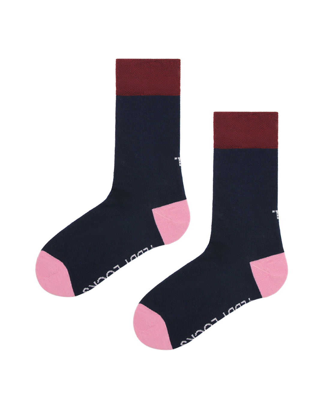 Pair of socks with dark blue body, burgundy top, and pink toes and heels from Teddy Locks